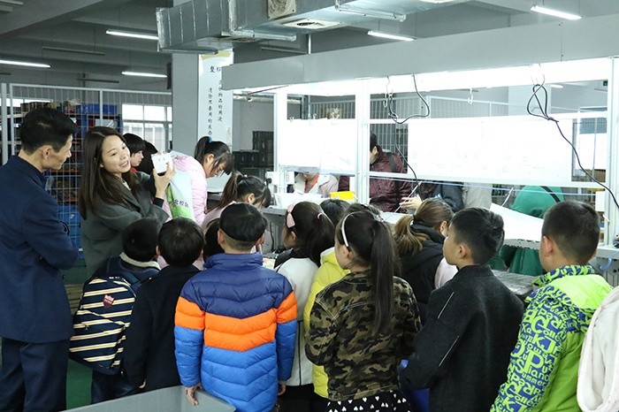 在相關(guān)負(fù)責(zé)人的引領(lǐng)下,“藍(lán)豆假日小隊(duì)”先后參觀了注塑生產(chǎn)車間,裝配車間,檢測(cè)室等工作區(qū)域,負(fù)責(zé)人也對(duì)廠內(nèi)設(shè)備、操作流程及生產(chǎn)工藝一一進(jìn)行了介紹。整齊有序的車間環(huán)境,車間工人有條不紊地工作著,轟隆的機(jī)器聲在整個(gè)車間回蕩,面對(duì)這些“素未謀面”的生產(chǎn)設(shè)備,孩子們東瞅瞅,西看看,滿是好奇。